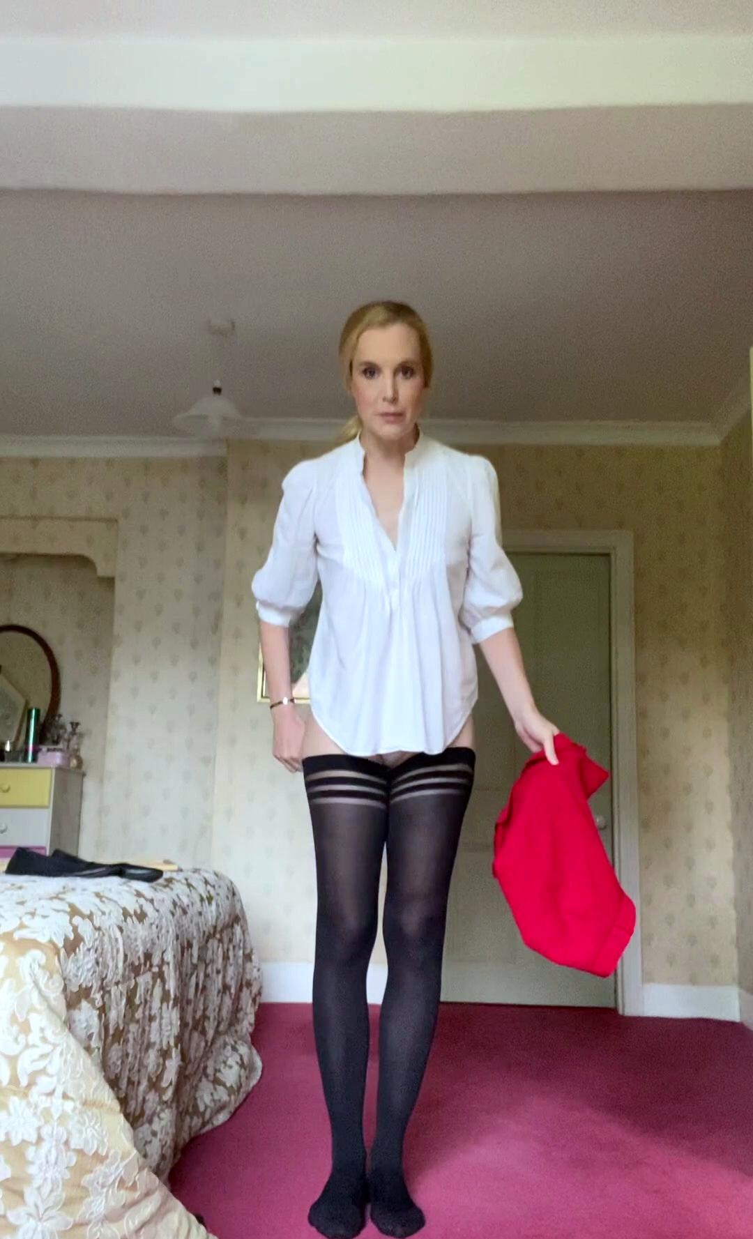 Bodacious bombshell in white stockings fucks a glass toy on the couch
