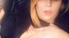 Slutty amateur flashing her big boobs in the backseat