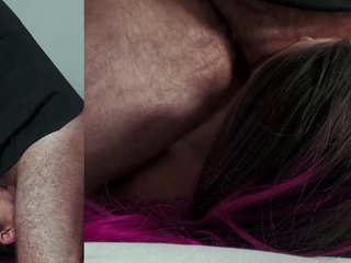 Striking brunette with long black hair and pretty tits shows her oral skills