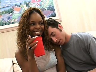 Delicious ebony chick Marie gets spit roasted by a pair of white rods