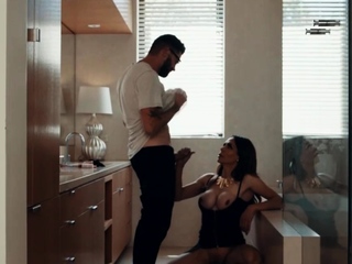 Busty latina trans Jessy Dubai is anal fucked in the kitchen