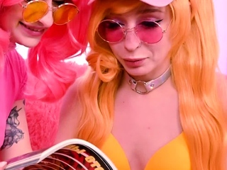 Pale blonde and tanned brunette lesbians toying and licking