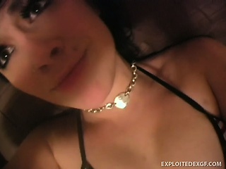 Pretty brunette teen lies on her back and seductively reveals her lovely boobs