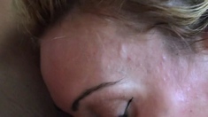 Blonde hottie Mae gobbles up his big prick and jerks out his cum