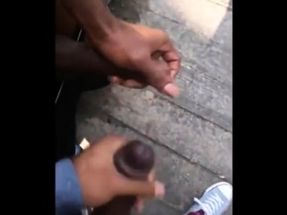 Two men cum together outside