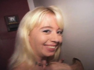 Adorable blonde with nice titties delivers awesome gloryhole blowjobs