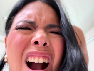 Her lovely body quivers as her tiny cunt gets drilled deep by the huge cock
