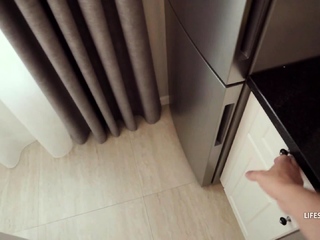 Brunette slut gives a POV blowjob to a big pecker