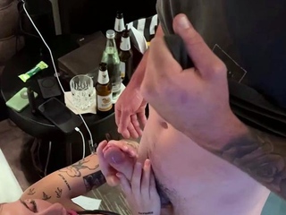 The stacked blonde lies on the couch and he fills her snatch with his hard cock