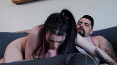 Small tit brunette sucks a big cock hardcore